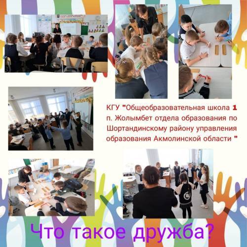 Достық-жылы жел, Достық-жарқын әлем, Достық-таң атқанда күн, Жан үшін көңілді мереке. Достық-бұл тек бақыт, Достық - адамдардың біреуі бар. Білім бөлімінің Жолымбет кенті № 1 жалпы білім беретін мектебі " КММ Ақмола облысы білім басқармасының Шортанды ауданы бойынша " 3 сыныпта сынып сағаттары өтті. Оқушылар нағыз достықтың не екенін біліп, Достық ережелерін жасады.